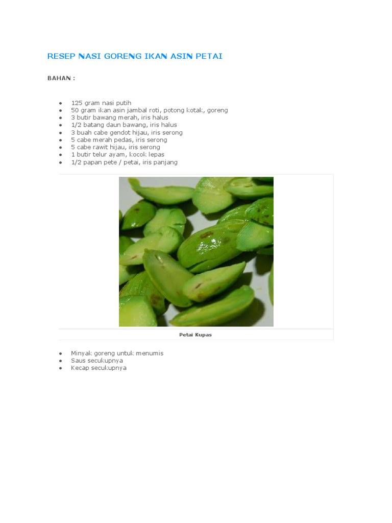 Aroma pete yang memiliki karakter yang khas dan kuat membuat nasi goreng ini sering kali menjadi idaman orang orang walaupun memang ada beberapa orang yang tidak terlalu meyukai pete. Menu kali ini bernama resep nasi goreng pete ikan asin dari judulnya saja pasti sudah diketahui isi dari nasi goreng ini terdiri dari pete dan ikan asin. Hasil pencarian untuk cah jambal pete.